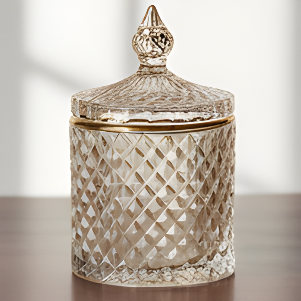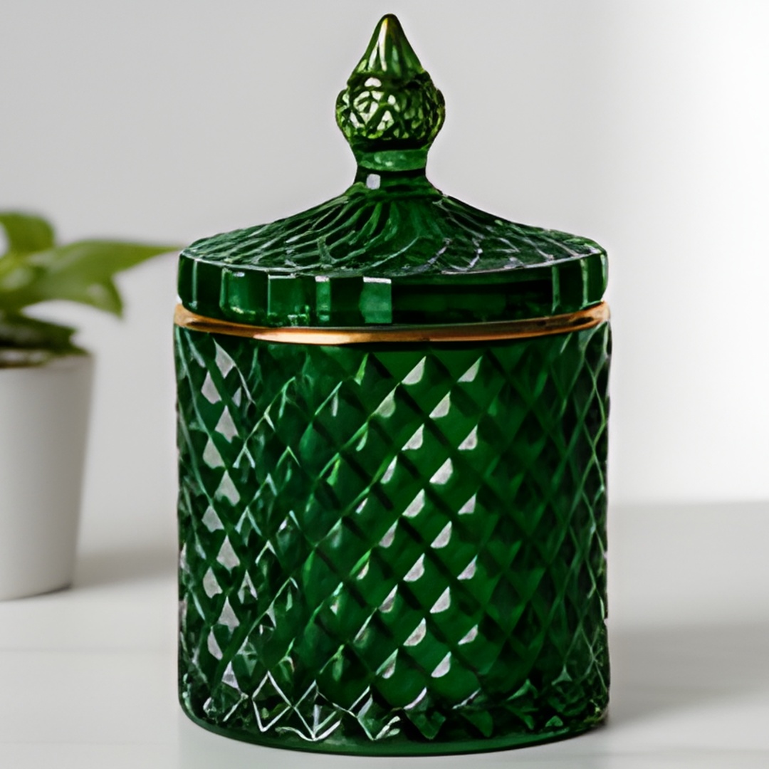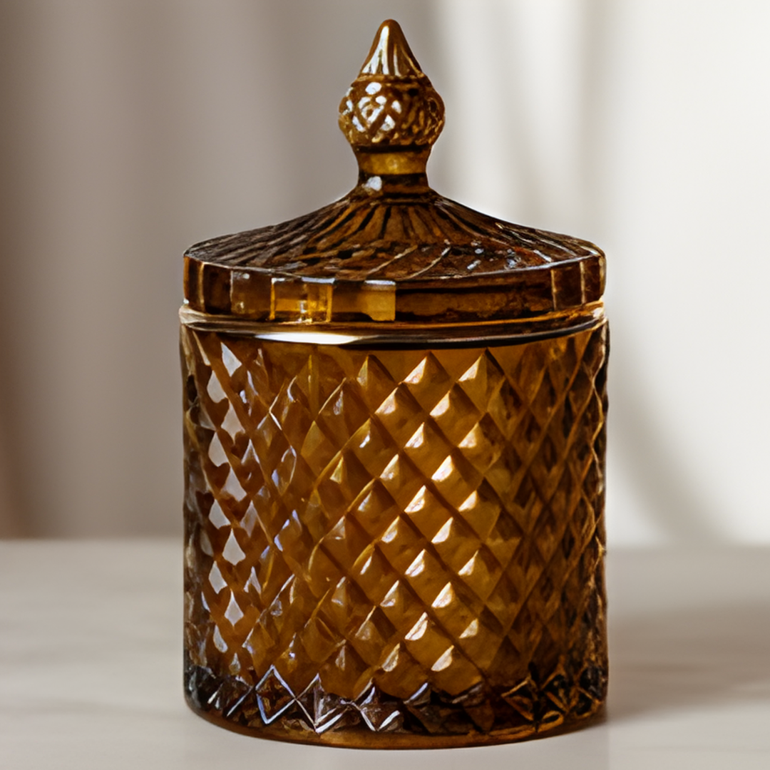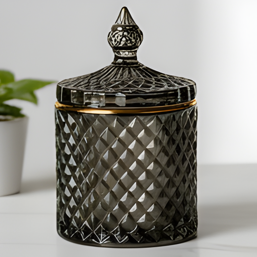 Crown-lid candle jar is manufactured from high-grade molded glass using automated precision machinery, ensuring consistent thickness and refined detailing. The diamond-cut textured body paired with an elegantly sculpted crown lid enhances visual appeal while helping to preserve the candle’s fragrance by minimizing aroma evaporation. Designed as a multipurpose container, it is ideal for luxury scented candles and can be repurposed for storage or decorative use after burning.